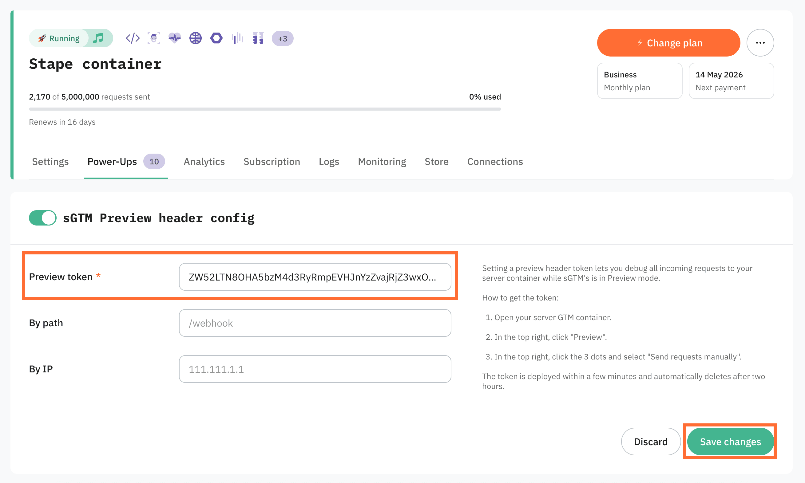 We added a new feature to the stape.io admin console that adds Server Preview Header and helps to debug incoming HTTP requests. The logic works like this: you use your server tagging URL inside the webhook URL and add a request path. At the same time, you should add the server GTM preview header in your Stape admin console.