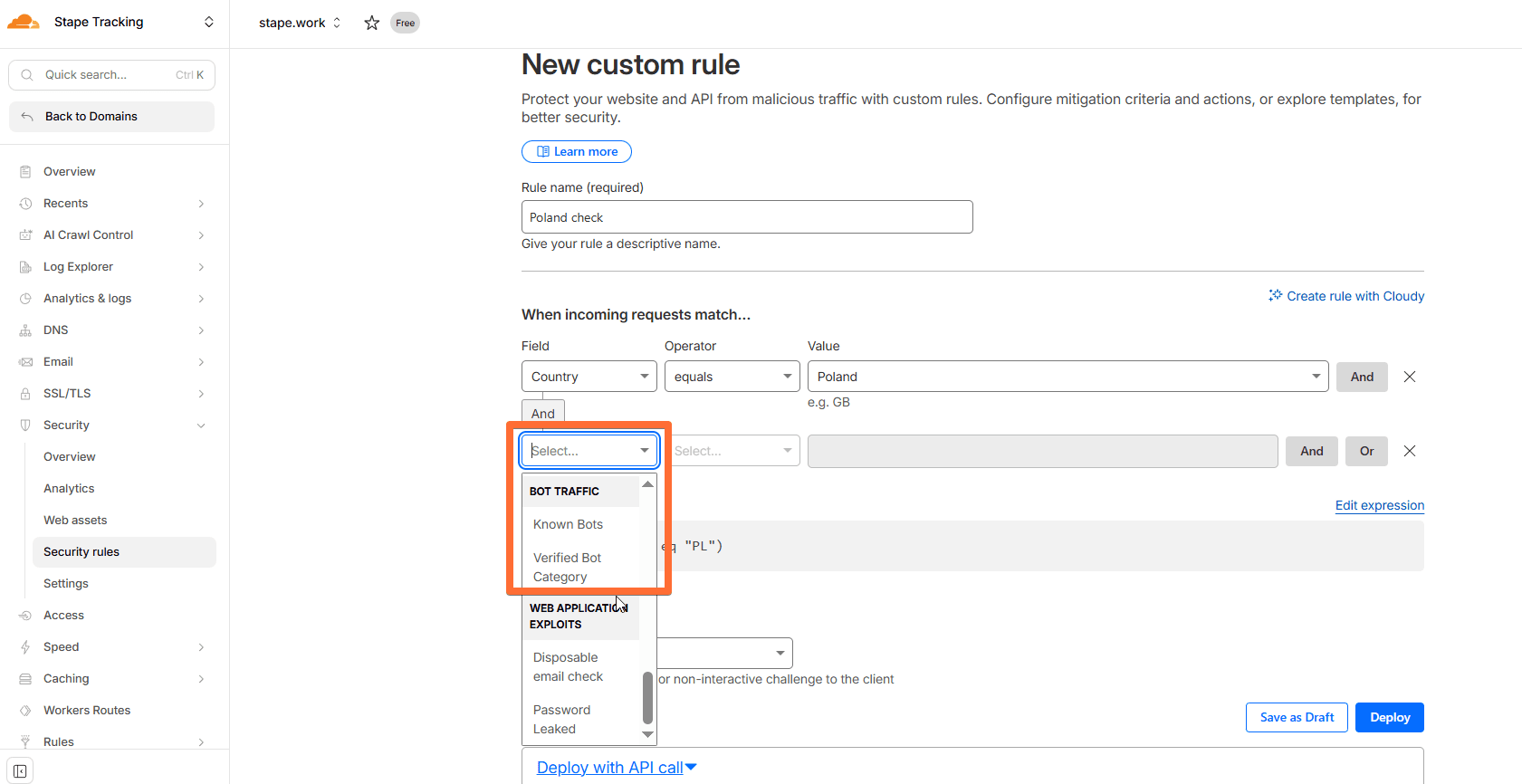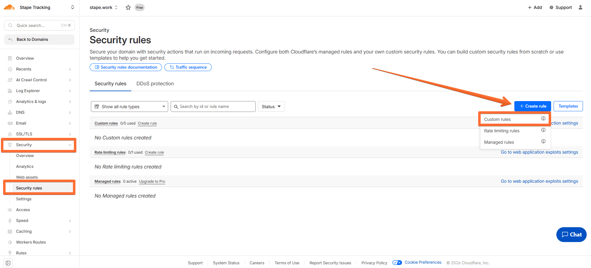 1. In your Cloudflare account, open the Security rules page → click Create rule → select Custom rules.