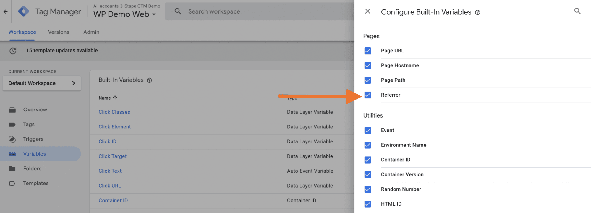 1. In your web GTM container, open the Variables menu → in your built-in variables, enable the Referrer variable.