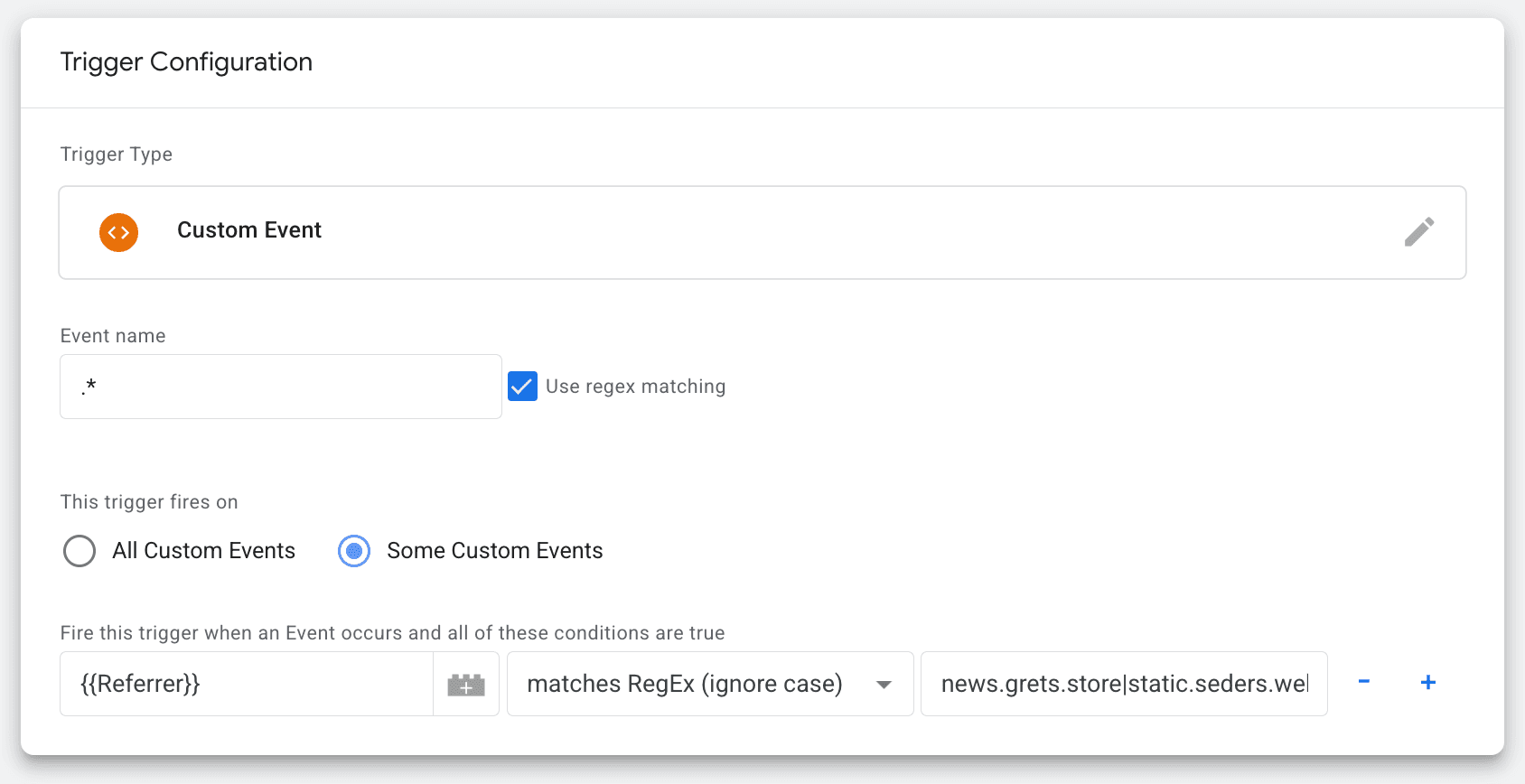 Specify the condition for the trigger: {{Referrer}} - matches RegEx (ignore case) - enter your spam domains. For several domains, use “|” without spaces (e.g.: news.grets.store|static.seders.website|another.domain)