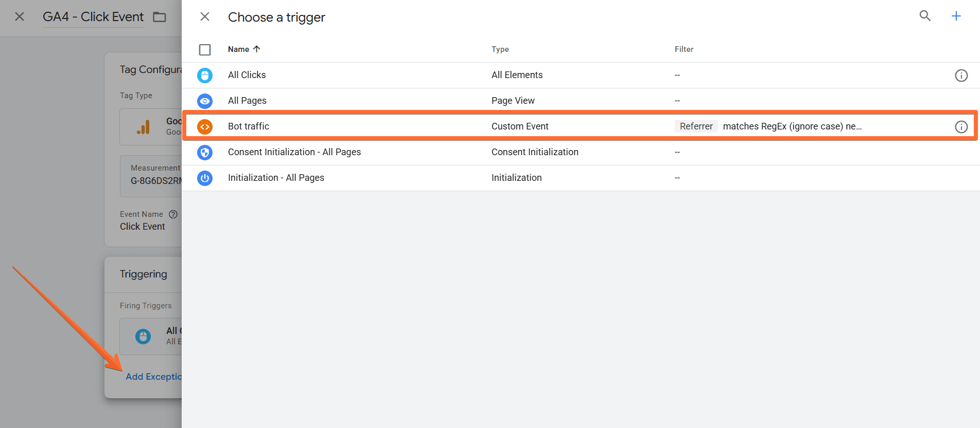 3. Add this trigger as an exception to your GA4 tags. Go to the Tags menu → select a tag → under Triggering, click Add Exception → select the trigger from the previous step.