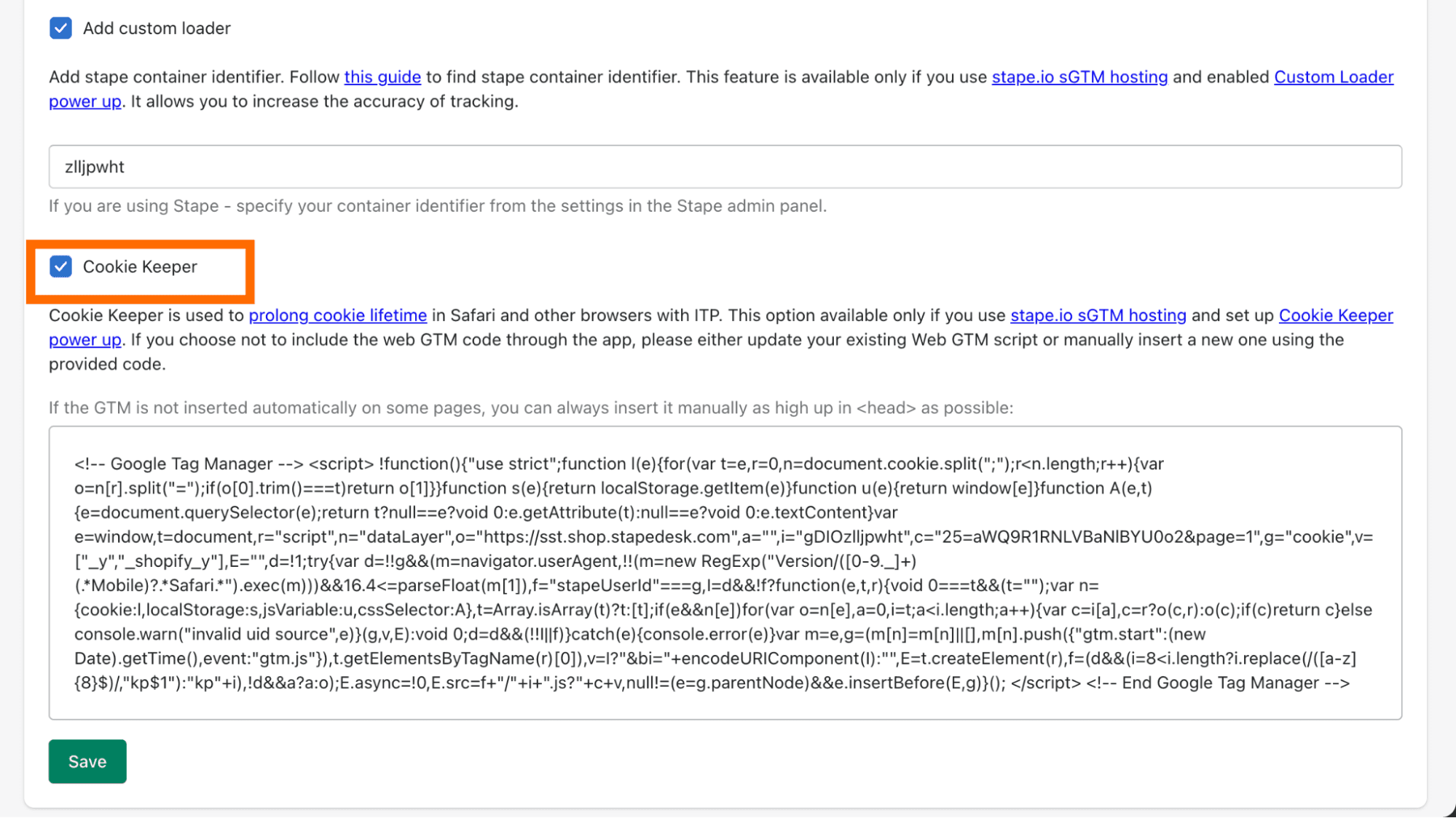 - Generate with Cookie Keeper - if enabled, the code will also add Cookie Keeper operation along with GTM loading.