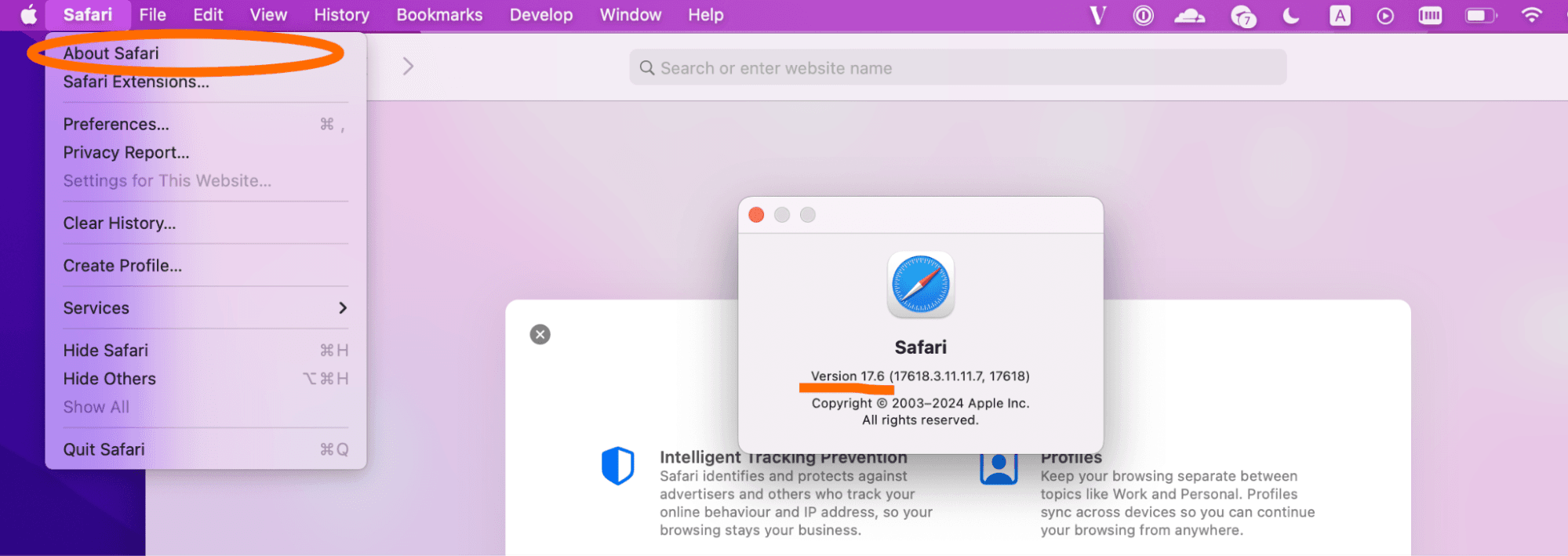 1. Open the Safari browser. Ensure you are using Safari version 16.4 or later. To confirm the version, click Safari in the menu bar and select About Safari.