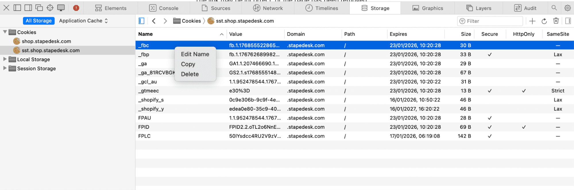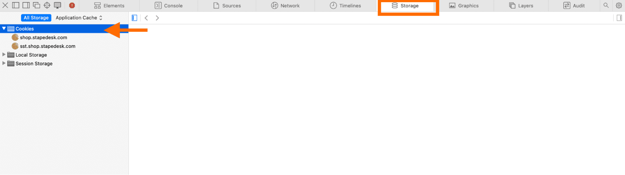 5. Access the Cookies section. In the left-hand panel under Storage, click Cookies to see all cookies associated with your store.