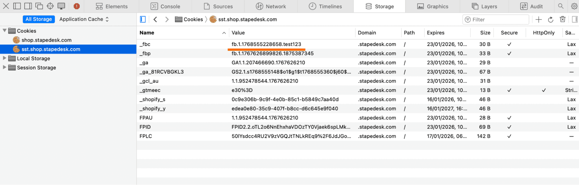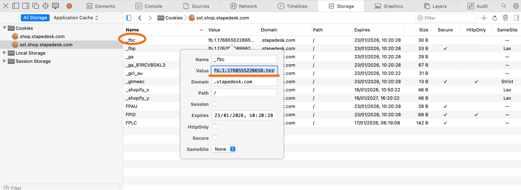 9. Confirm the _fbc cookie. After the second refresh, find the _fbc cookie again. Its value should be the same as the one you saved earlier.