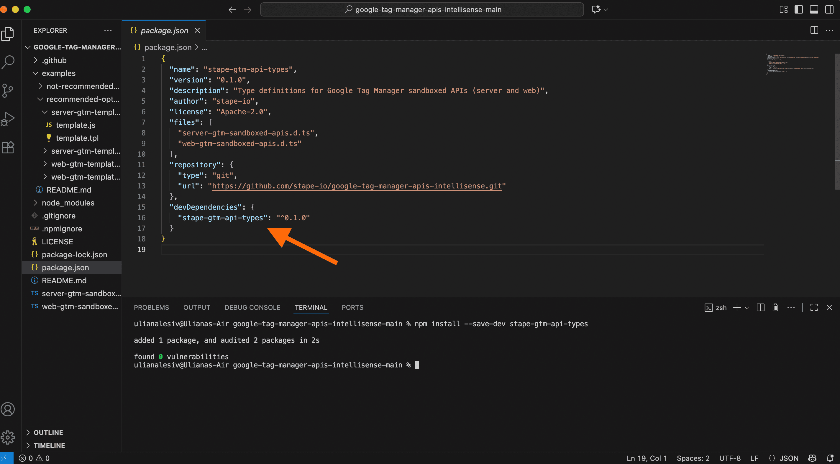 3. Install the type definitions using a package manager you’ve chosen (npm or pnpm) in the root of the folder that contains your GTM template JavaScript file: