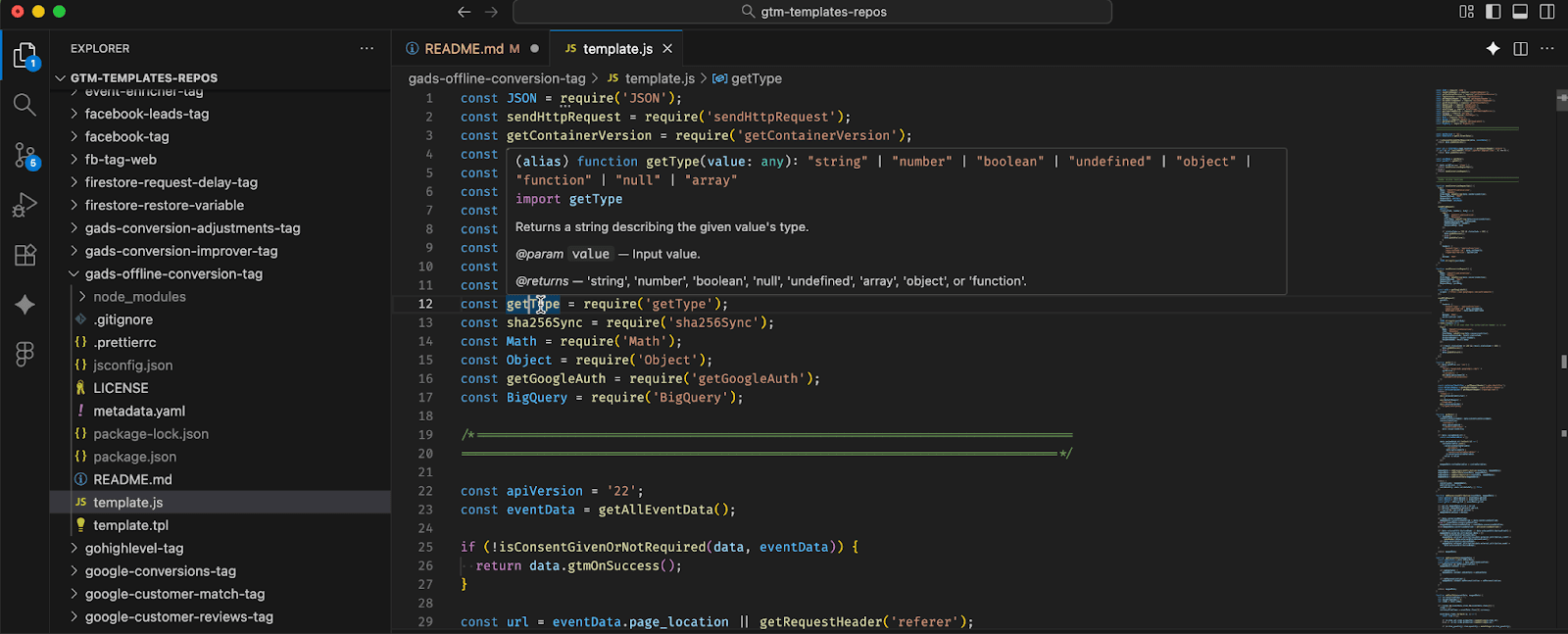 Regardless of the method you’ve chosen, make sure to periodically run the following command in the folder that contains your GTM template JavaScript files. This will make sure you receive any Intellisense updates.