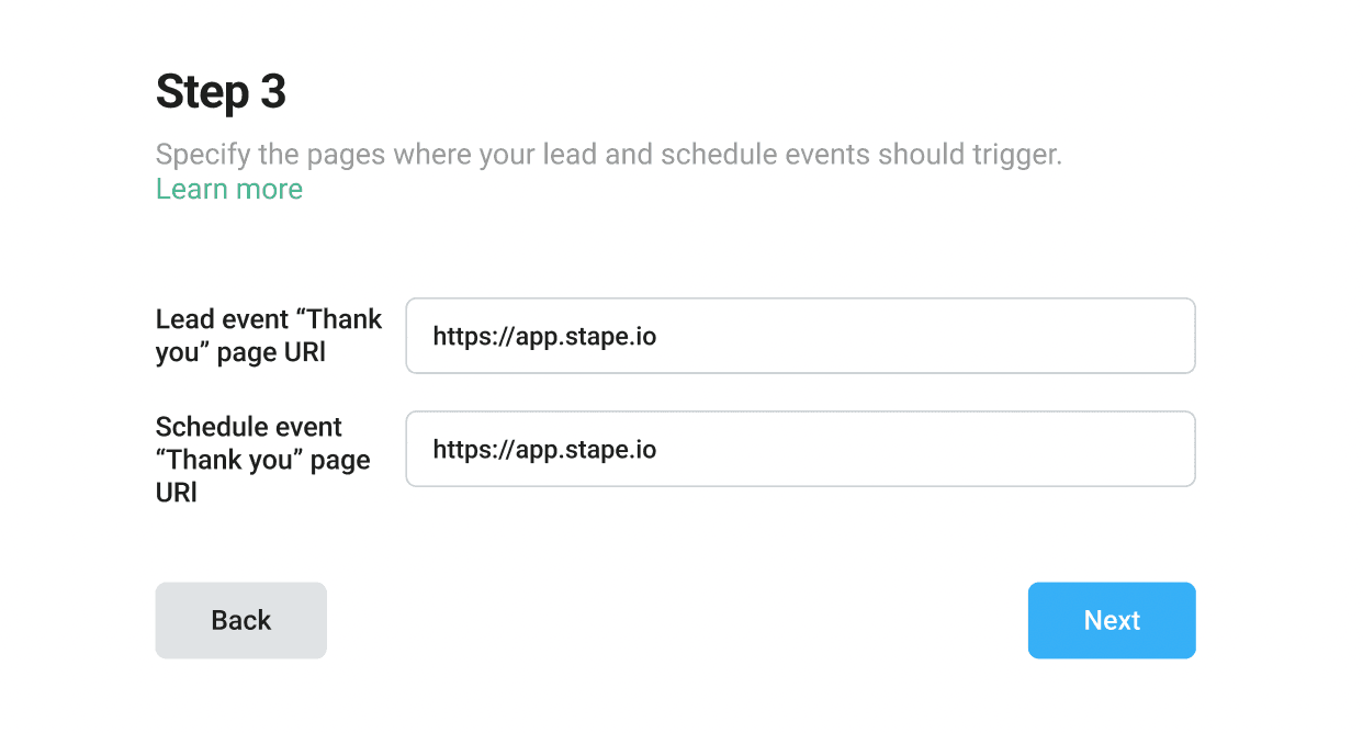 On the third step of the Setup Assistant configuration, you can optionally add the URL of “thank you pages” that users get to after they fill out the lead form (field Lead event “Thanks you” page URL) and/or schedule a call (field Schedule event “Thanks you” page URL).