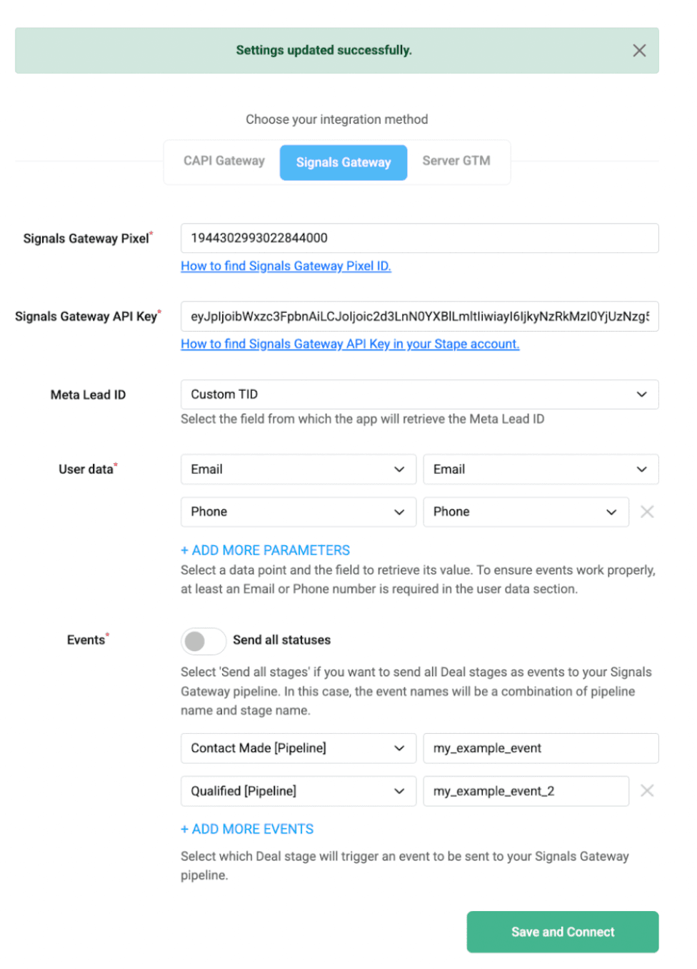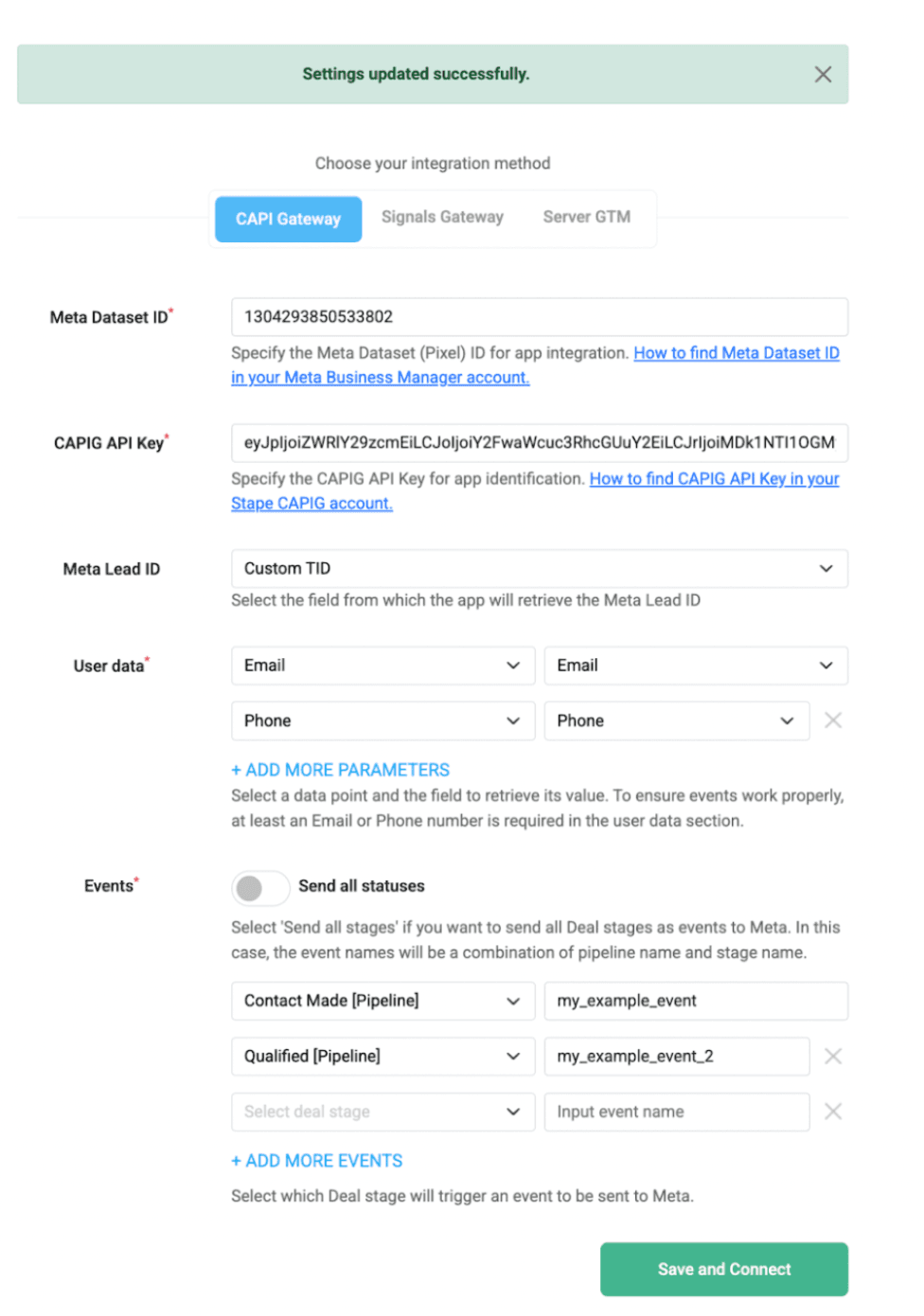 With this app, you can configure the relevant fields once, and it will automatically monitor the stages of your Deals. It will then send the corresponding conversion events to CAPI Gateway, server GTM container, or Signals Gateway, ensuring accurate and efficient tracking of your lead conversions.
