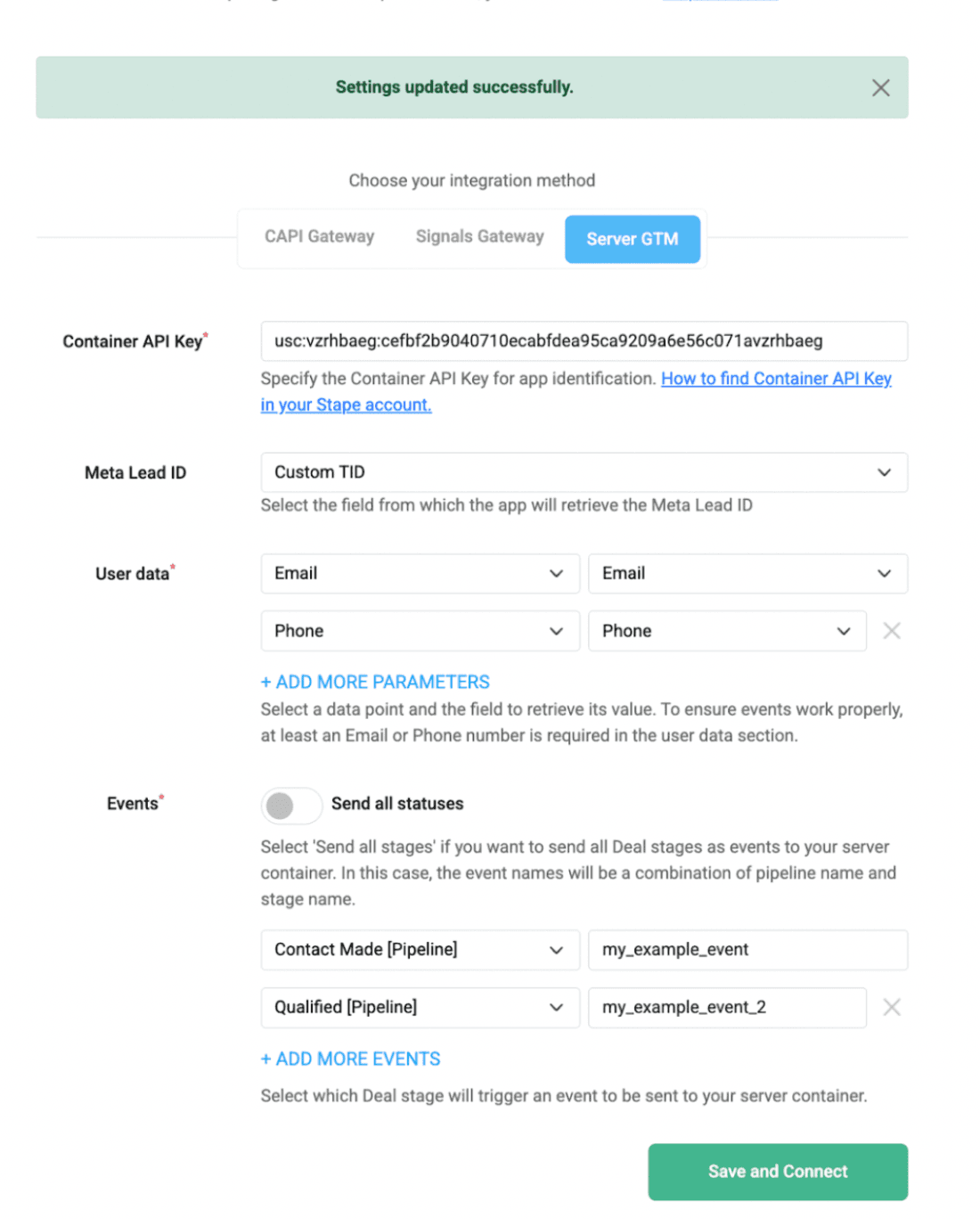 For more detailed instructions, check Stape’s article on how to set up Meta Conversions API Gateway. |